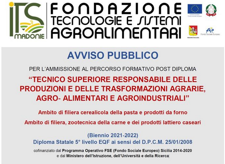 Nell’area interna delle Madonie nasce la figura di “Tecnico superiore responsabile delle produzioni e delle trasformazioni agrarie, agroalimentari e agroindustriali”. A darne notizia è il presidente Pietro Macaluso e l’assessore alla Pubblica Istruzione dell’Unione Madonie, Daniela Fiandaca. Il percorso formativo post diploma è stato attivato dall’ITS Madonie, della quale fa parte l’Unione, e sarà avviato presso l’ISIS Failla Tedaldi di Castelbuono. Le iscrizioni sono già aperte e dovranno pervenire entro il 18 febbraio prossimo. Due i corsi che possono essere scelti: Bread&Pasta (ambito della filiera cerealicola per la pasta e i prodotti da forno) e Meat&Cheese (ambito di filiera zootecnica da carne e dei prodotti lattiero-caseari). I destinatari sono giovani ed adulti residenti o domiciliati in Sicilia, occupati o disoccupati, in possesso diploma di istruzione secondaria di secondo grado oppure di diploma professionale conseguito al termine dei percorsi quadriennali e integrato da un percorso di istruzione e formazione tecnica superiore di durata annuale. Il corso avrà una durata biennale (1800 ore tra formazione e tirocinio) e si svolgerà tra laboratori e aziende con la supervisione di docenti e tutor aziendali provenienti dall’Università e dal mondo del lavoro e delle professioni dei settori delle due filiere produttive. “L’attivazione di questo corso – afferma Daniela Fiandaca – si colloca nell’ambito di quanto previsto nella Strategia dell’Area Interna Madonie resilienti: laboratorio di futuro e può diventare una opportunità di sviluppo e di lavoro perché la filiera dell’agroalimentare costituisce una delle principali specializzazioni produttive del territorio.” Il corso è cofinanziato dal Programma Operativo FSE (Fondo Sociale Europeo) Sicilia 2014-2020 e dal Ministero dell’Istruzione, dell’Università e della Ricerca. Per maggiori informazioni www.itsmadonie.it