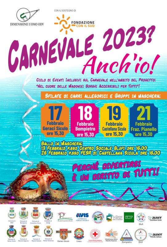 Torna sulle Madonie “Carnevale 2023? Anch’io”! Il ciclo di eventi inclusivi dedicato a persone con Esigenze Speciali. L’iniziativa è sostenuta da Fondazione con il Sud nell’ambito del Progetto “Borghi Accessibili per Tutti”. Volontari e Amministratori operano in sinergia per rendere Accessibile a Tutti le principali manifestazioni del Carnevale. Sì tratta di uno degli eventi di Rete più vasti delle Alte Madonie, svolto in collaborazione tra i diversi Comuni e Ets. Ci vediamo presto! Perché divertirsi è un diritto di TUTTI!!!